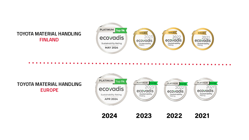 Vastuullisuus ja sen kehittäminen on Toyotalle ominaista. Haastamme itsemme joka päivä jatkamaan suunnannäyttäjänä, ja vaatimustaso on kova. Emoyhtiömme Toyota Material Handling Europe on saavuttanut Ecovadiksen platinum-tason joka vuosi vuodesta 2020 lähtien, ja lisäksi jokaiselta Toyota Material Handling Europen maayhtiöltä vaaditaan paikallinen Ecovadis-arviointi.